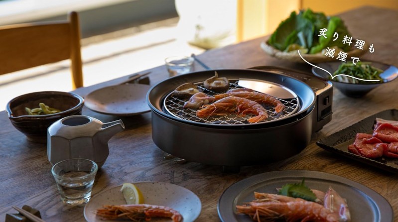 焼き網使用時は油受けに水を入れることで煙を軽減し、煙のにおいも気になりにくい設計です。食卓で焼きものを楽しむ際の悩みを軽くしてくれます。 site